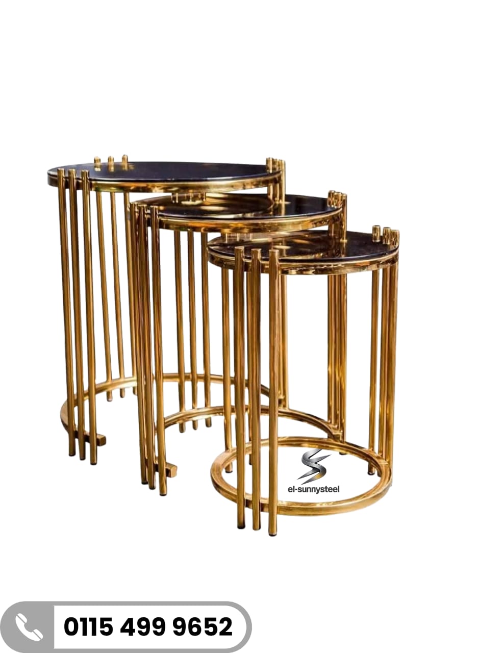 طقم سفرة مودرن فخم مكون من ترابيزة دائرية بسطح زجاجي وقاعدة من الاستانلس الذهبي اللامع بتصميم دوائر متداخلة أنيق، ومعاه ٤ كراسي بظهر مبطن بالقطيفة الأسود الفاخر وإطار ذهبي مميز بتفريغات هندسية عصرية. 🔸 ضيفي لمسة فخامة على سفرتك مع…